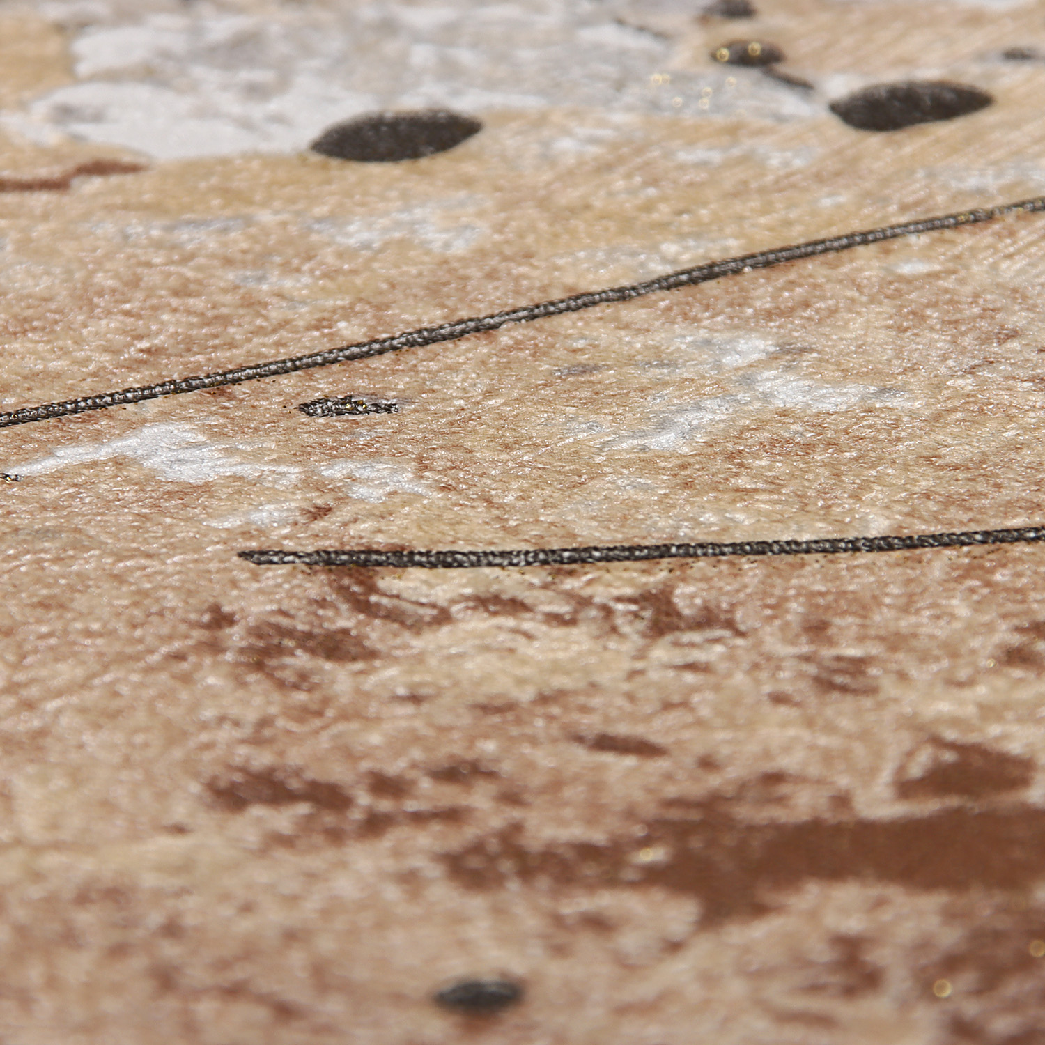 В зависимости от колористики, брызги выполнены из перламутра темного или светлого оттенка, переливающегося, словно под софитами выставочного пространства. Игру цвета также дополняют пятна, различные по своей форме и цветовому тону. Обилие разноцветного глиттера, словно вуаль покрывает полотна, усиливая эффект сияния и приковывая взор к обоям.