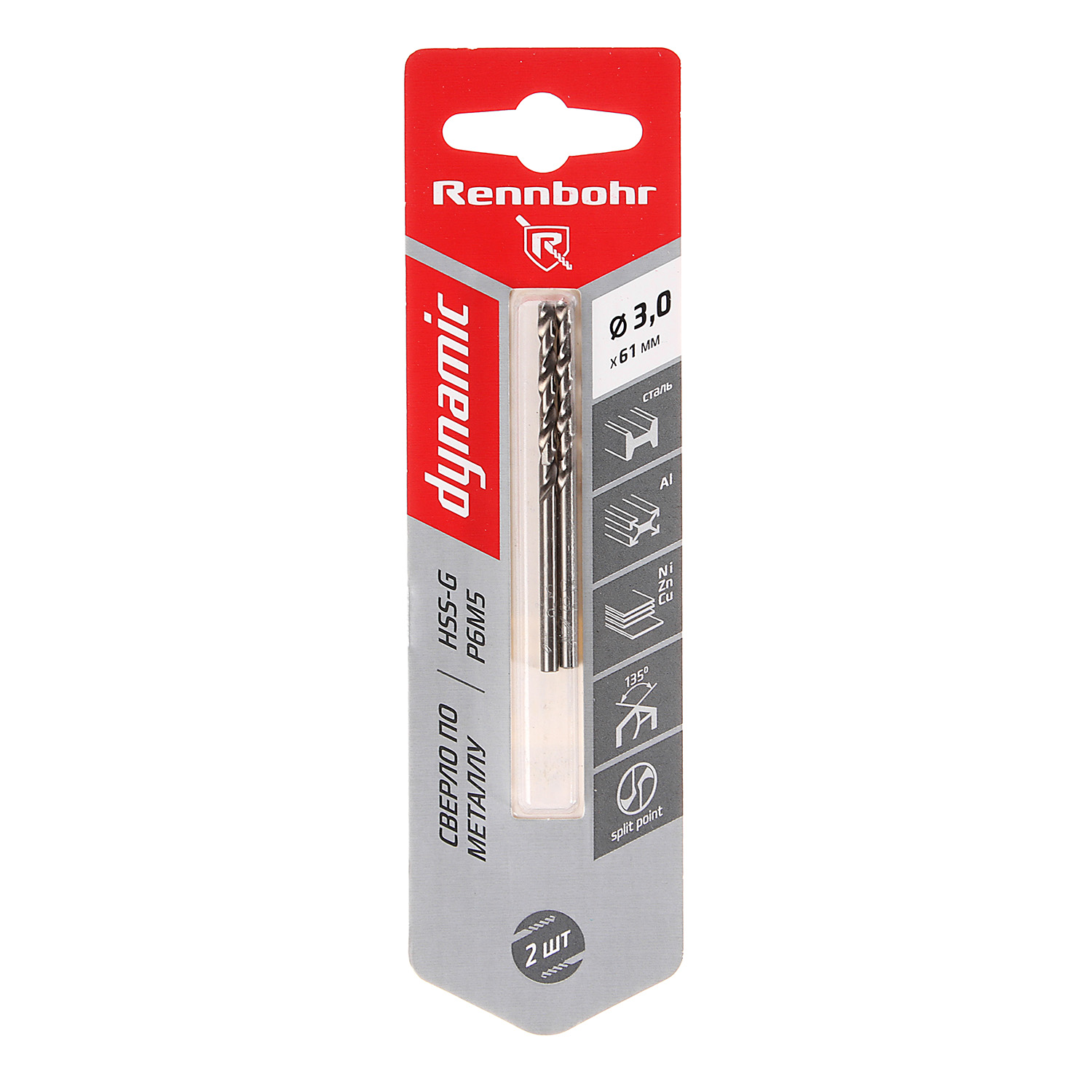 Сверло по металлу 3,00*61/33мм HSS-G P6M5 (2шт) блистер арт.675030 DYNAMIC RENNBOHR *10/40/640