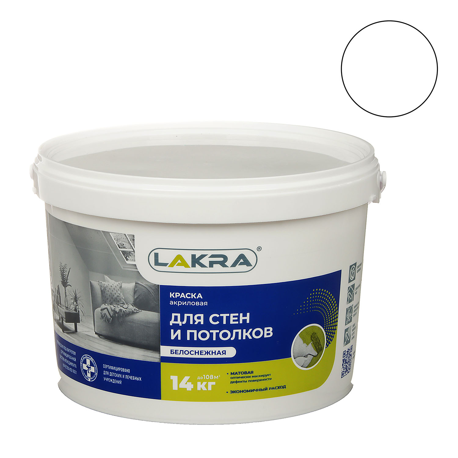 Краска акриловая 14 кг для стен и потолков ЛАКРА, белоснежная