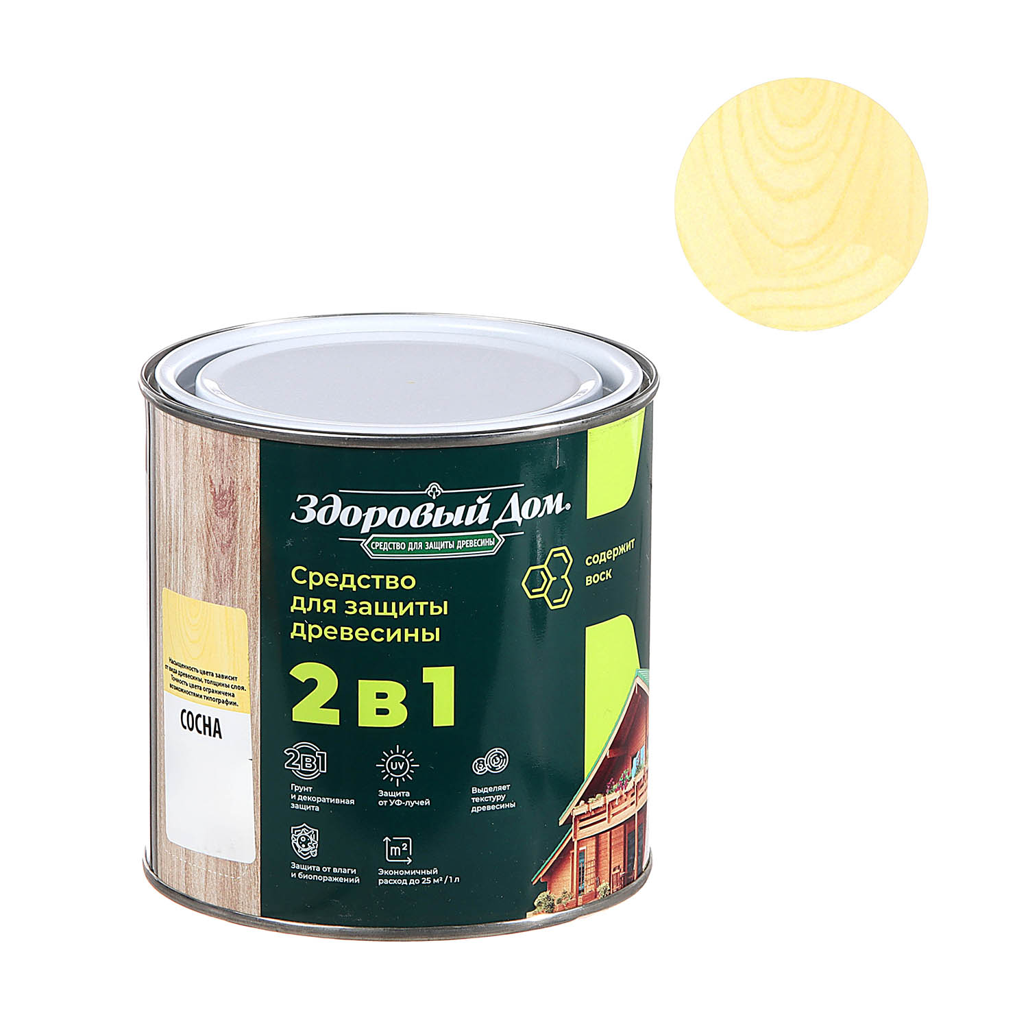 Деревозащитное средство Здоровый дом 2 в 1 сосна 0.8 л представляет собой высокоэффективное покрытие для декоративной отделки древесины и защиты поверхностей на срок до 8 лет. Формула 2 в 1 позволяет наносить состав без предварительного использования грунта.