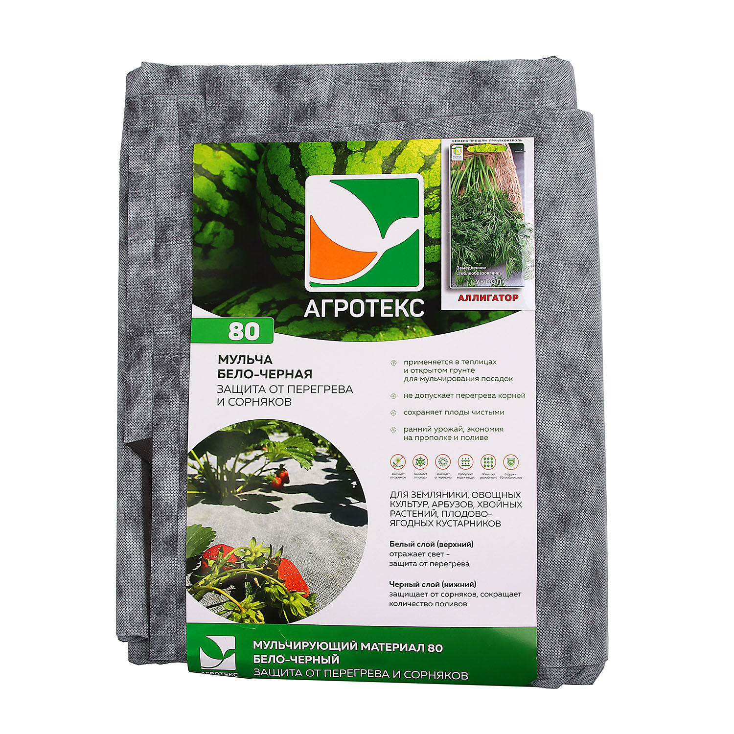 Верхний белый слой материала отражает прямые солнечные лучи, обеспечивая растения необходимым количеством света, предотвращая перегрев корней и появление ожогов. Нижний черный слой сдерживает рост сорняков и равномерно прогревает почву.