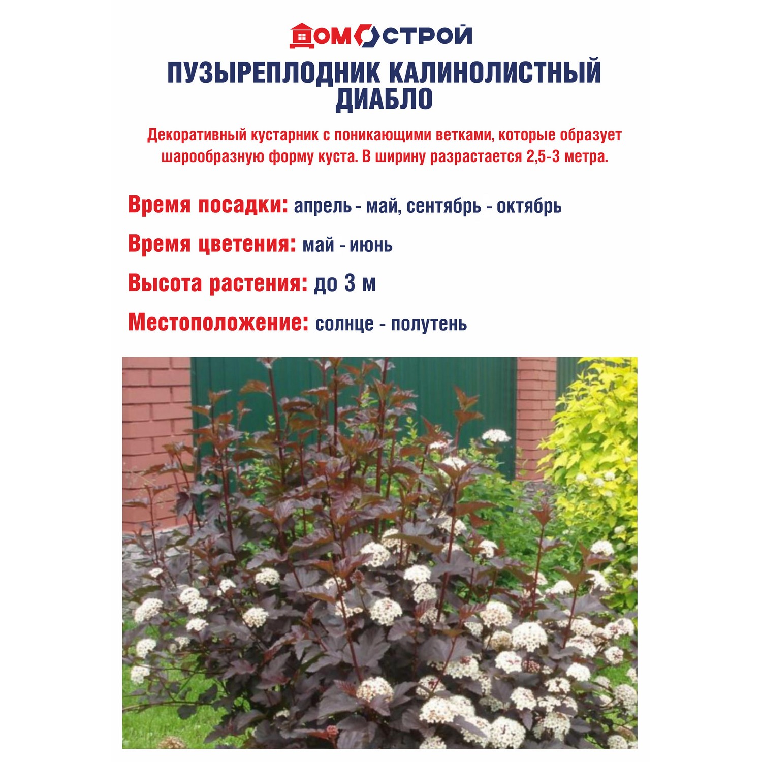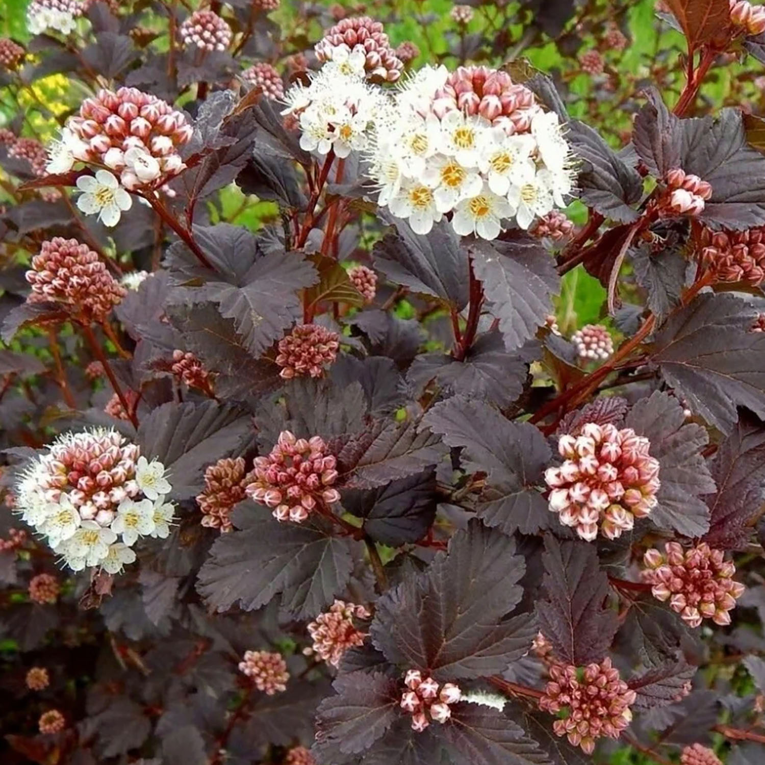 Пузыреплодник калинолистный «Diabolo» – декоративный кустарник с поникающими ветками, которые образует шарообразную форму куста. Высота куста достигает 3 метра. В ширину разрастается 2.5-3 метра. Цвет листьев пузыреплодника зелено-красный с фиолетовым оттенком. Цветение начинается с конца мая или с середины июня, зависит от региона, где растет растение. Цветение длится около трех недель. Цвет соцветий белого цвета с легкой розовинкой. После цветения образуются плоды, которые напоминают надутые пузыри. Цвет плодов красного цвета. Сажать саженцы пузыреплодника Диабло можно на солнечной стороне, в полутени и в тени, но в тени листья не будут такими красно-фиолетовыми, из-за этого куст не будет смотреться так декоративно. Пузыреплодник в уходе не прихотлив. Он хорошо растет в парках, в саду, на аллеях, возле дороги как живая изгородь. В уходе пузыреплодник не сильно прихотлив, не любит много влаги, корневая система может загнить, зато хорошо переносит засуху. Имеет высокую морозостойкость, выдерживает минус 40-45 гр.
