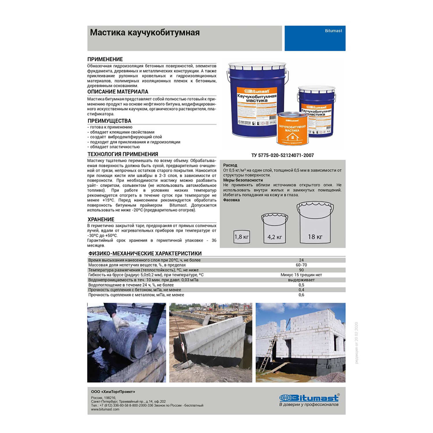 Обмазочная гидроизоляция бетонных поверхностей, элементов фундамента, деревянных и металлических конструкции. А также приклеивание рулонных кровельных и гидроизоляционны хматериалов, полимерных изоляционных пленок к бетонным, деревянным основаниям.
