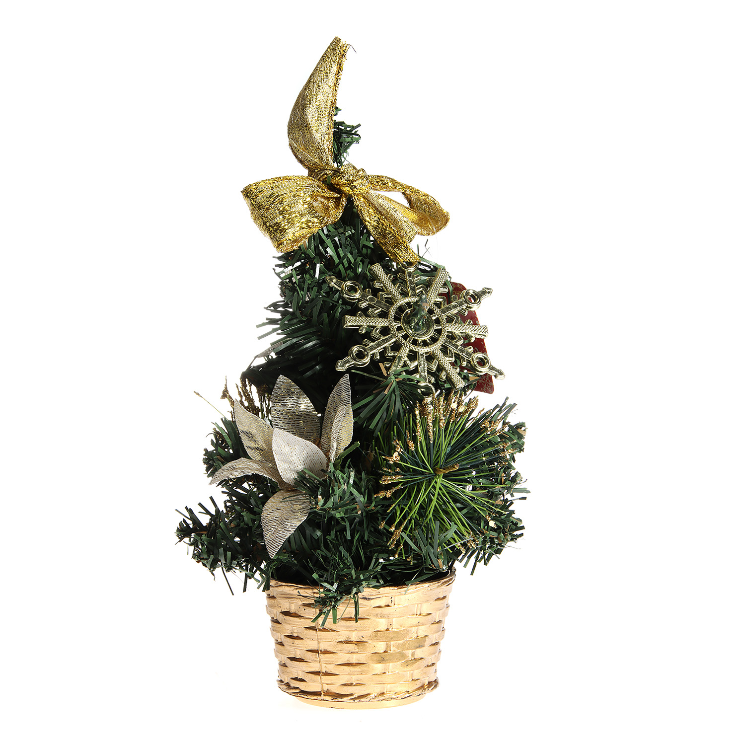 Декоративная елка Зимнее волшебство «Снежинка» – прекрасное решение для символического оформления стола, тумбы или полки к Новому году. Компактная 20-сантиметровая елочка украшена различными декоративными элементами в золотых оттенках и помещена в плетеную корзинку, поэтому деревце выглядит нарядно и празднично. Добавьте интерьеру новогоднего настроения вместе с декоративной елкой Зимнее волшебство!