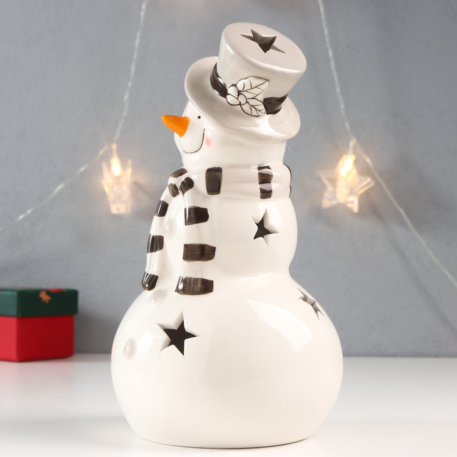 Сувенир керамика свет "Снеговик в бежевом цилиндре и полосатом шарфе" 22х12,5х12,5 см 7620342