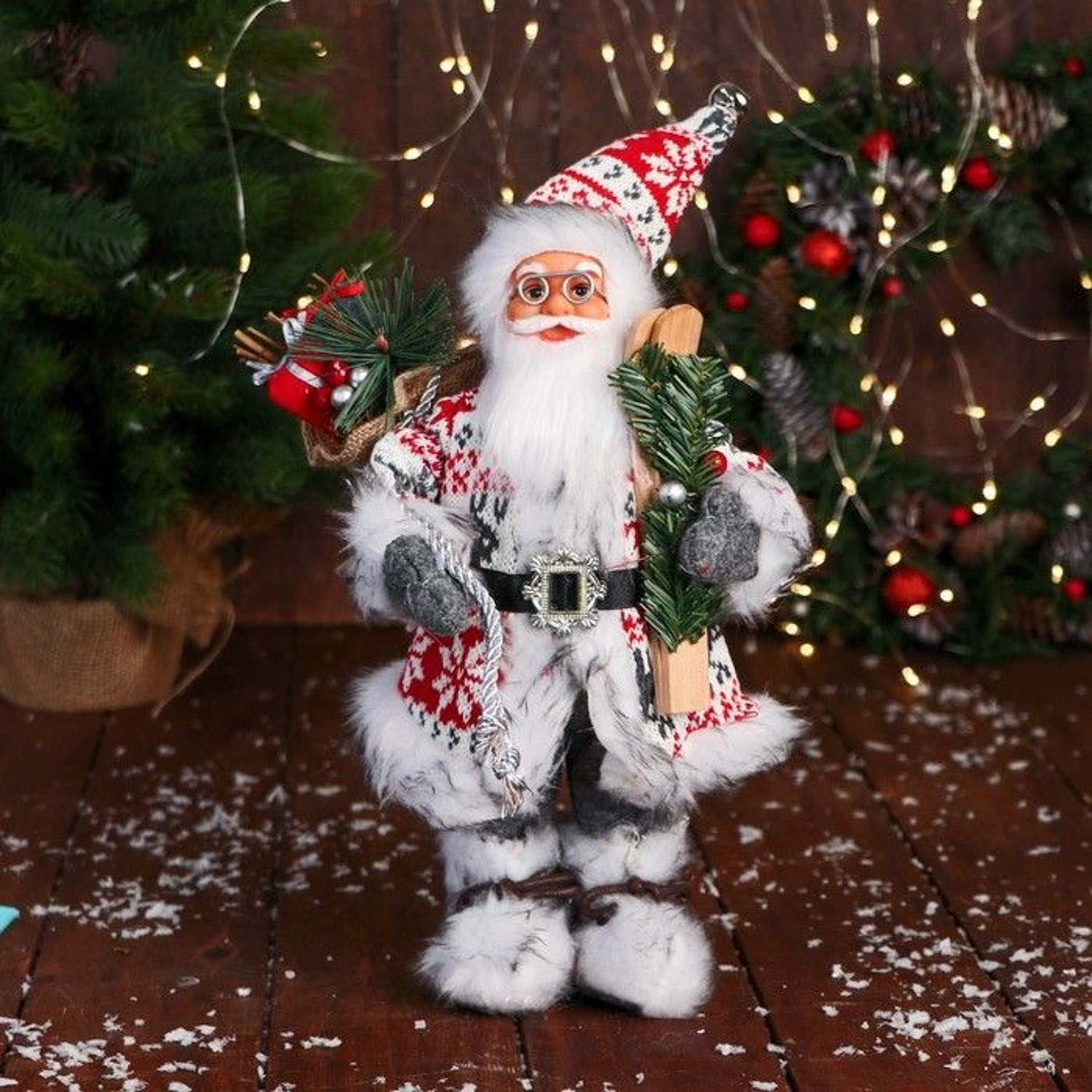 Дед Мороз "В костюме с орнаментом, лыжами и веточками" 31 см, красно-белый 9692515