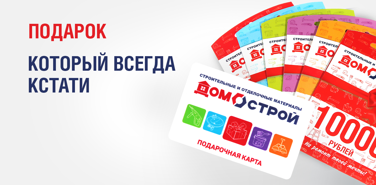 В преддверии праздника порой так сложно определиться с подарком: как угадать с презентом и не потратить деньги впустую? Подарочная карта в ДомоСтрой – удобный и практичный подарок для ваших близких, коллег и бизнес-партнеров. Вручить подарочную карту можно профессиональным мастерам, дизайнерам, садоводам и дачникам, хозяйкам и хранителям домашнего очага, автолюбителям, новоселам и всем тем, кто затеял стройку или ремонт. Подарите свободу выбора и возможность воплотить задуманные идеи в жизнь!